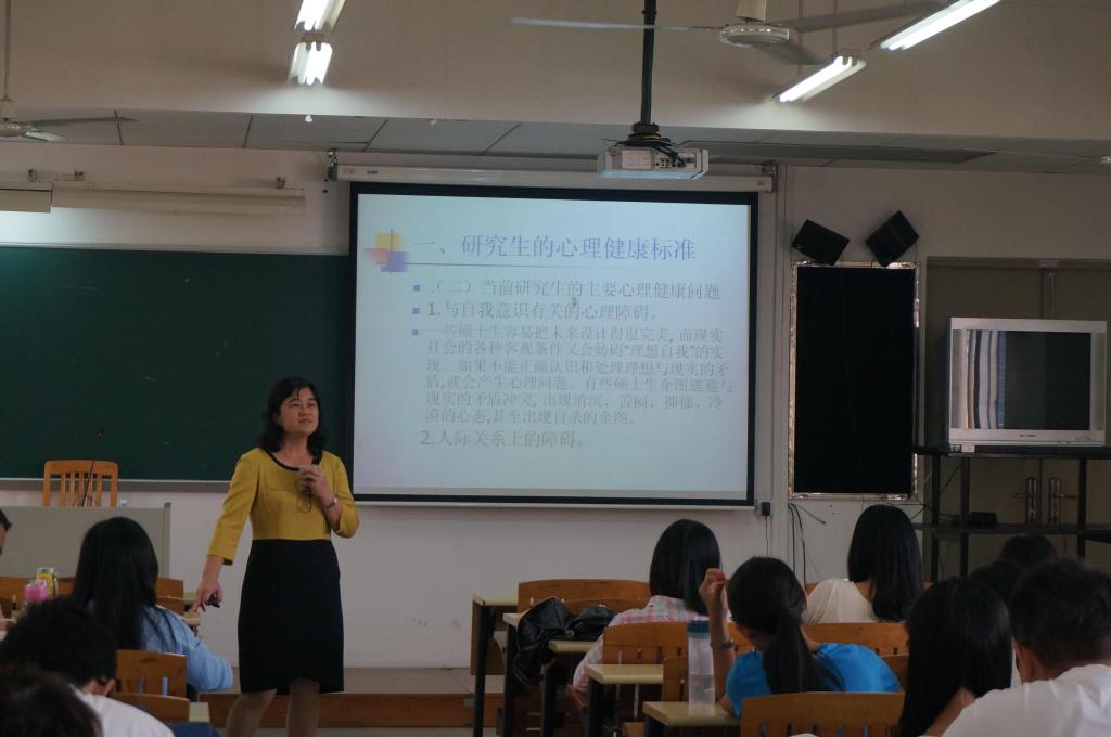 黄秀娟老师作为经贸学院的党委书记,同时也是心理教育方面的专家,她曾经担任广外大心理健康教育与咨询中心的主任和广东省普通高校学生心理健康与教育指导委员会委员,在高校学生的心理健康教育方面有丰富的理论和实践经验。黄秀娟书记首先围绕“研究生心理健康标准”、“国际商务人才心理素质要求”与“研究生心理健康与心理素质的提升”等方面的内容为同学们进行了详细的讲解,并结合历史人物曾国藩、李世民等案例强调了培养高情商的重要性。