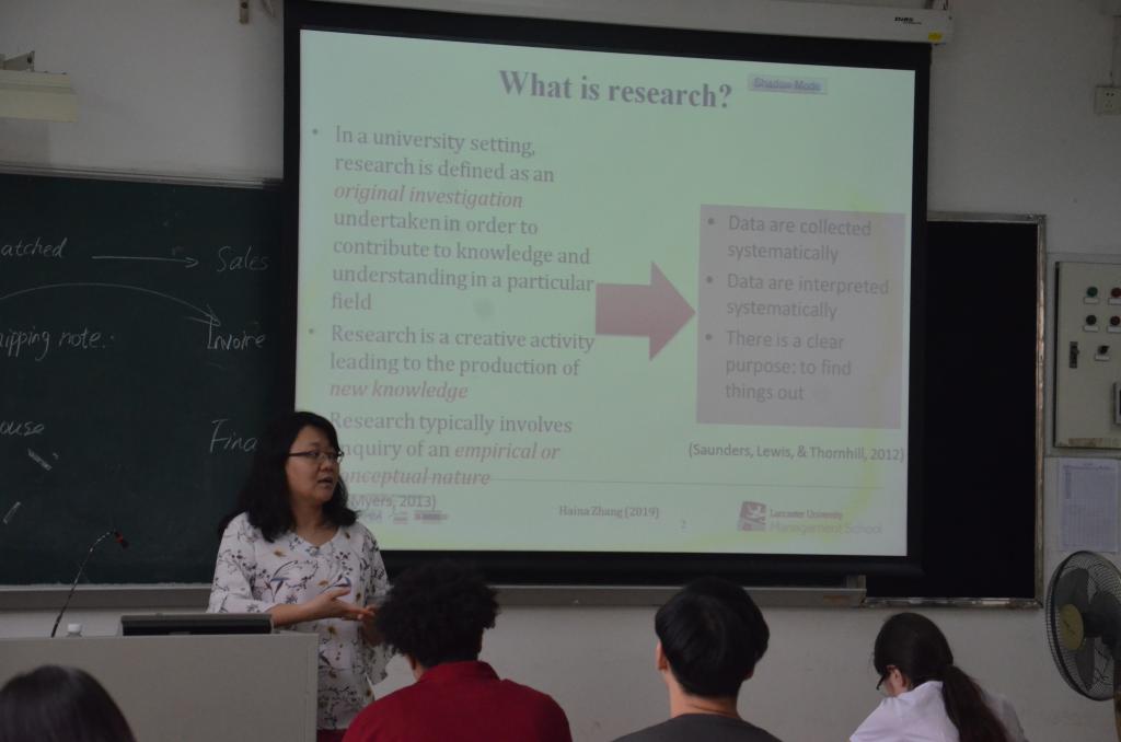 2019年4月11日(周四)下午2:30-4:00,张海娜教授在南校区教学楼F212展开了以“Research Design”为主题的讲座。参加讲座的有经贸学院2018级国际商务硕士生。