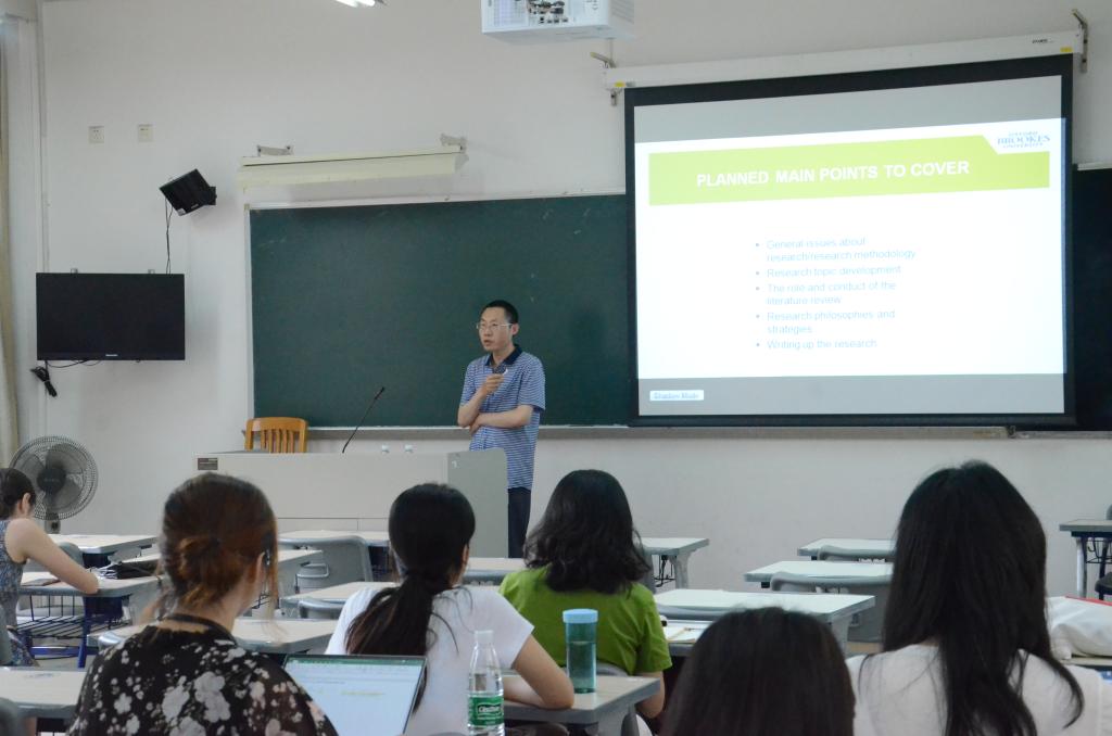 之后王教授以《Talk about Methodology in Business and Management Research》为主题进行了专题讲座。以何为研究发问,对学生论文的研究方法提出很多中肯有效的建议。关于研究主题,王教授认为要与研究者的兴趣和方向一致,才能在长时间的研究里保持研究热情。王教授以Goldilocks为例解释到,研究流程要密切联系研究问题,从遇到问题、陷入瓶颈到解决问题的过程中,需要注意调节情绪坚持到最后。王教授向同学们介绍在文献综述的撰写时,要注意对文献质量进行筛选,在阅读时学会用批判性的思维梳理文章,匹配自己的研究需求。专题讲座结束后王教授与同学们亲切交流、热切互动。